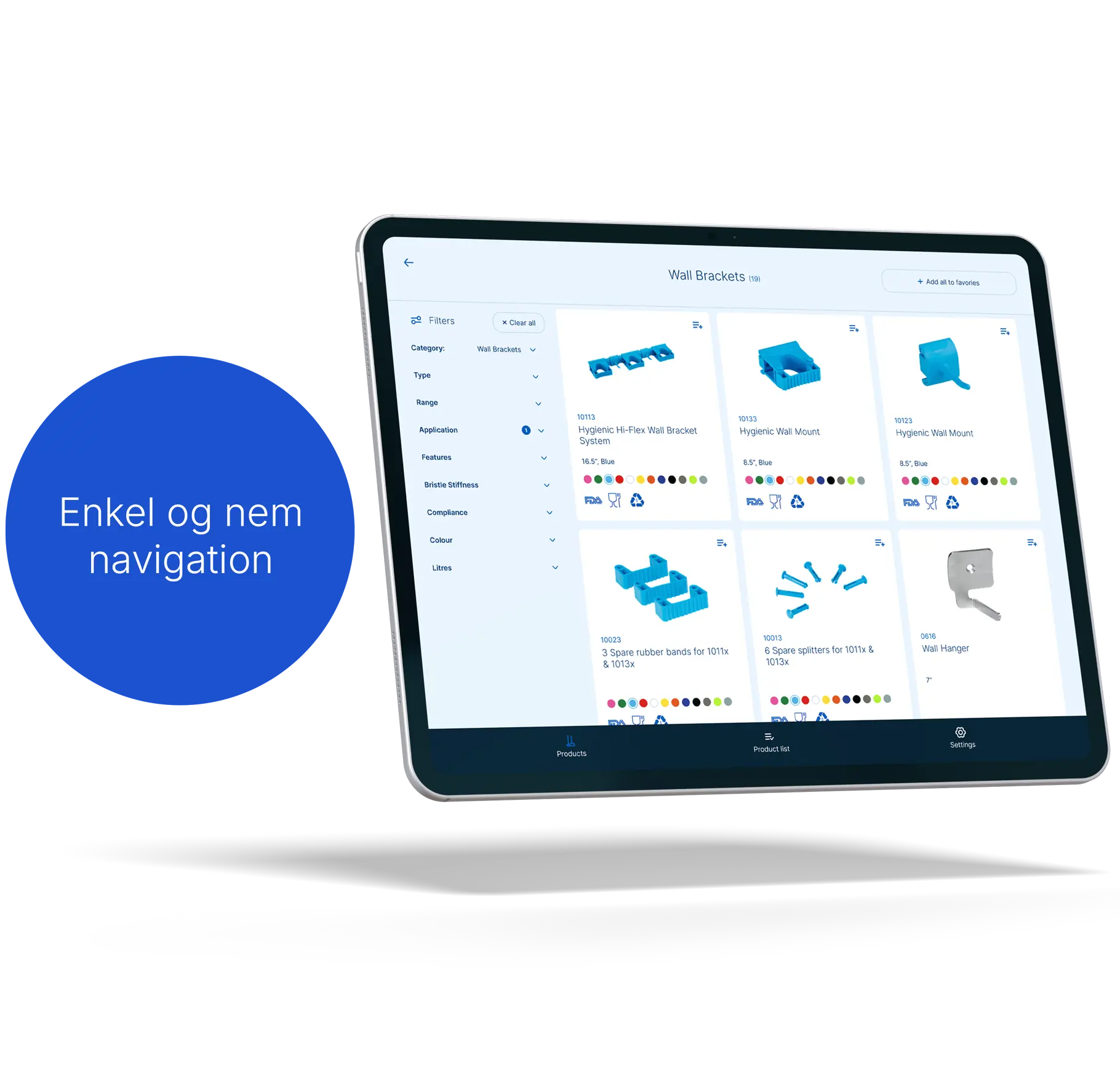 Det er lige så nemt at dele produktinformation. Send lister direkte til din distributør eller indkøbsafdeling, når lageret skal fyldes op. Og ved at bruge vores digitale katalog i stedet for trykt materiale bidrager du aktivt til at reducere miljøpåvirkningen.