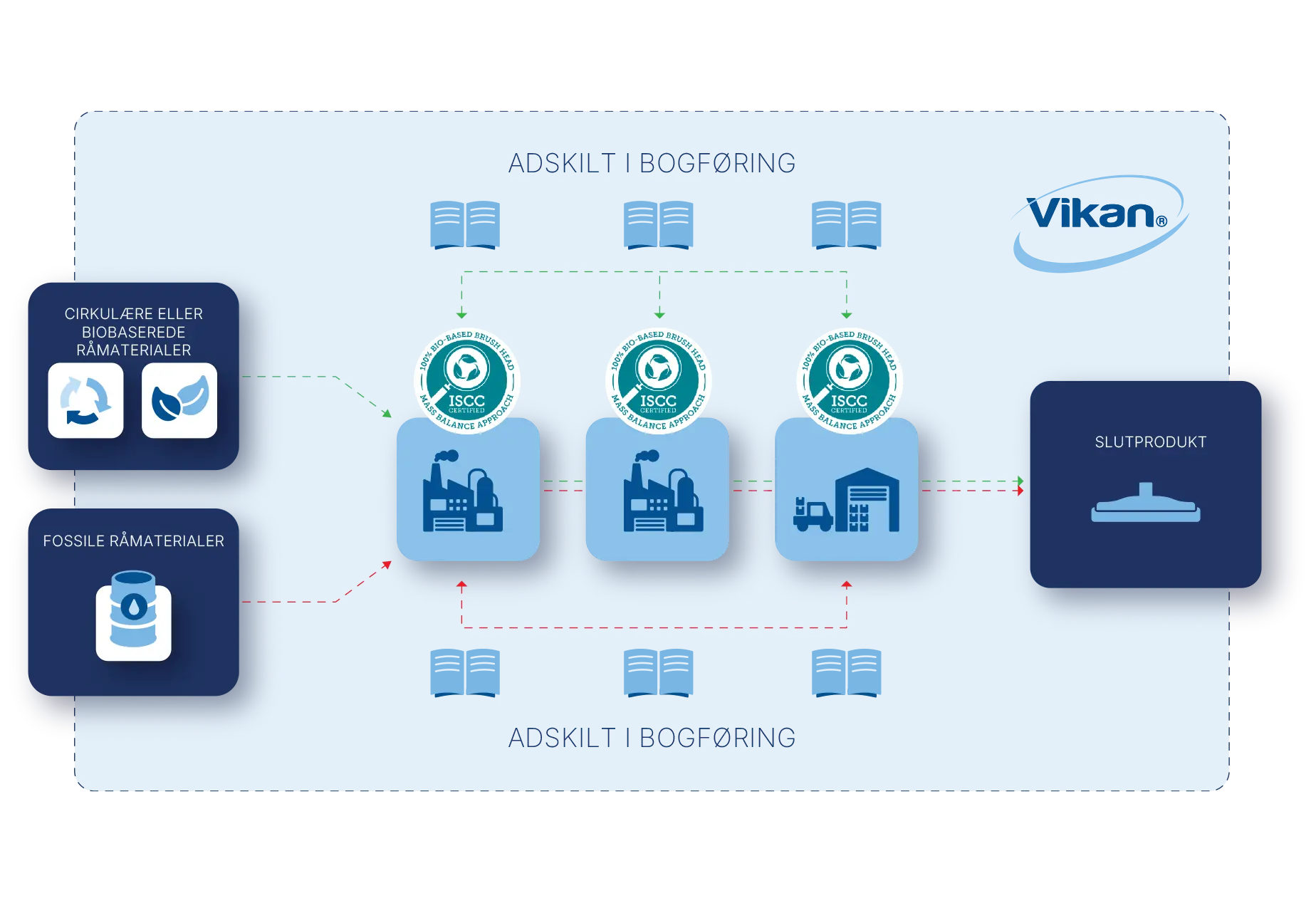 Tilsætningen af biobaserede råmaterialer sker ved fremstillingen af selve plasten. Oliebaserede råmaterialer blandes med biobaserede råmaterialer, hvilket resulterer i ny plast. Vikan og vores leverandører fører detaljerede optegnelser over de biobaserede råmaterialer, og de valideres af ISCC gennem hele produktionsprocessen.