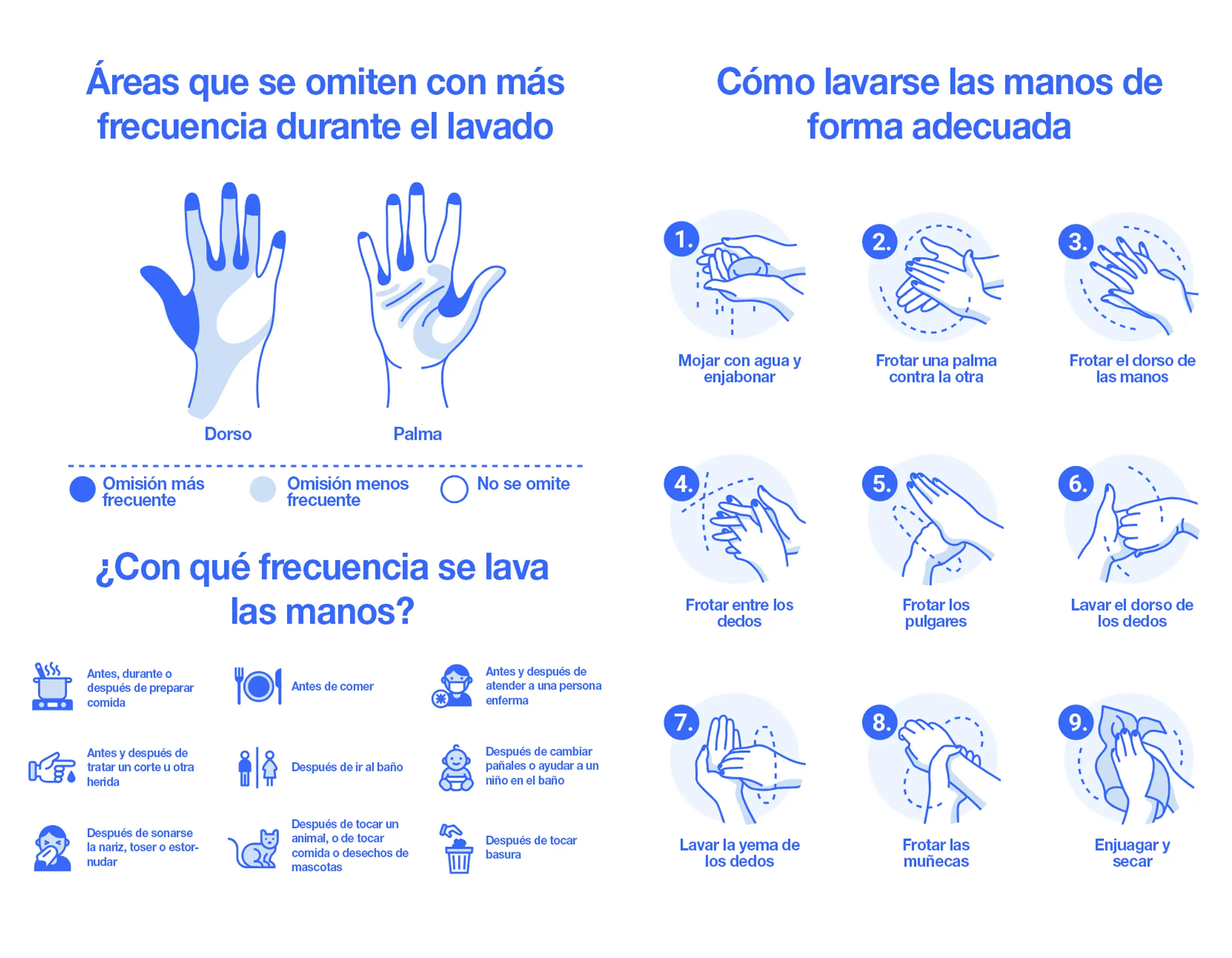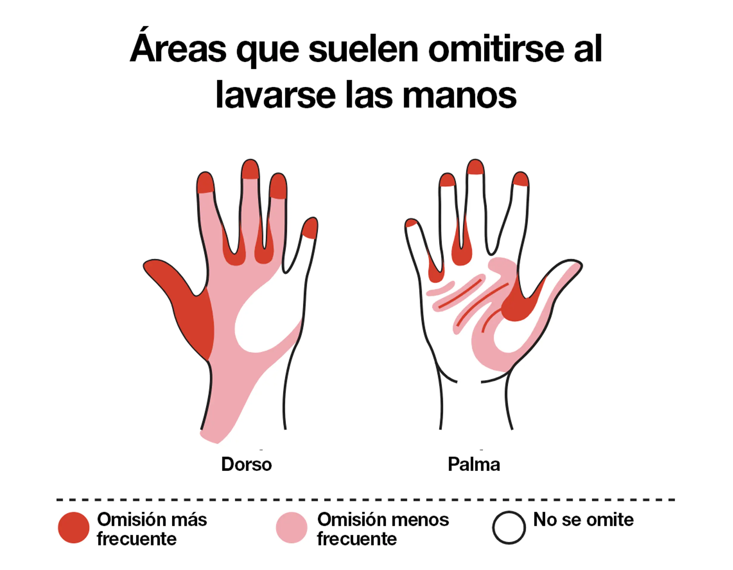 Lavarse las manos es una práctica de higiene personal básica pero indispensable para prevenir la contaminación y enfermedades en establecimientos de manipulación de alimentos; no obstante, incluso cuando los manipuladores de alimentos cumplen con esta medida, ello puede resultar insuficiente. Un control de la higiene de manos(7) tras lavárselas reveló un patrón de zonas que suelen pasarse por alto: