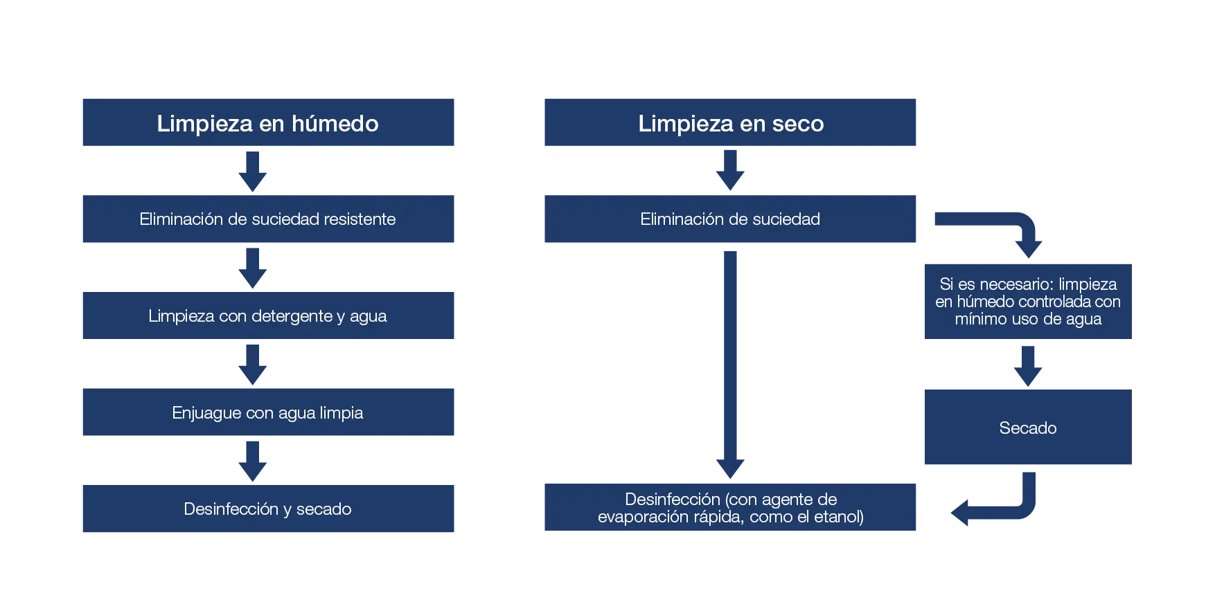 Al realizar la limpieza en seco, debe evitarse el uso de agua; los desinfectantes, además, deben ser de evaporación rápida. Si es necesario, puede llevarse a cabo una limpieza en húmedo controlada con mínimo uso de agua. Asegúrese de secar los equipos después de una limpieza en húmedo controlada, ya que cualquier resto de humedad podría incrementar el riesgo de desarrollo microbiano y contaminación cruzada.