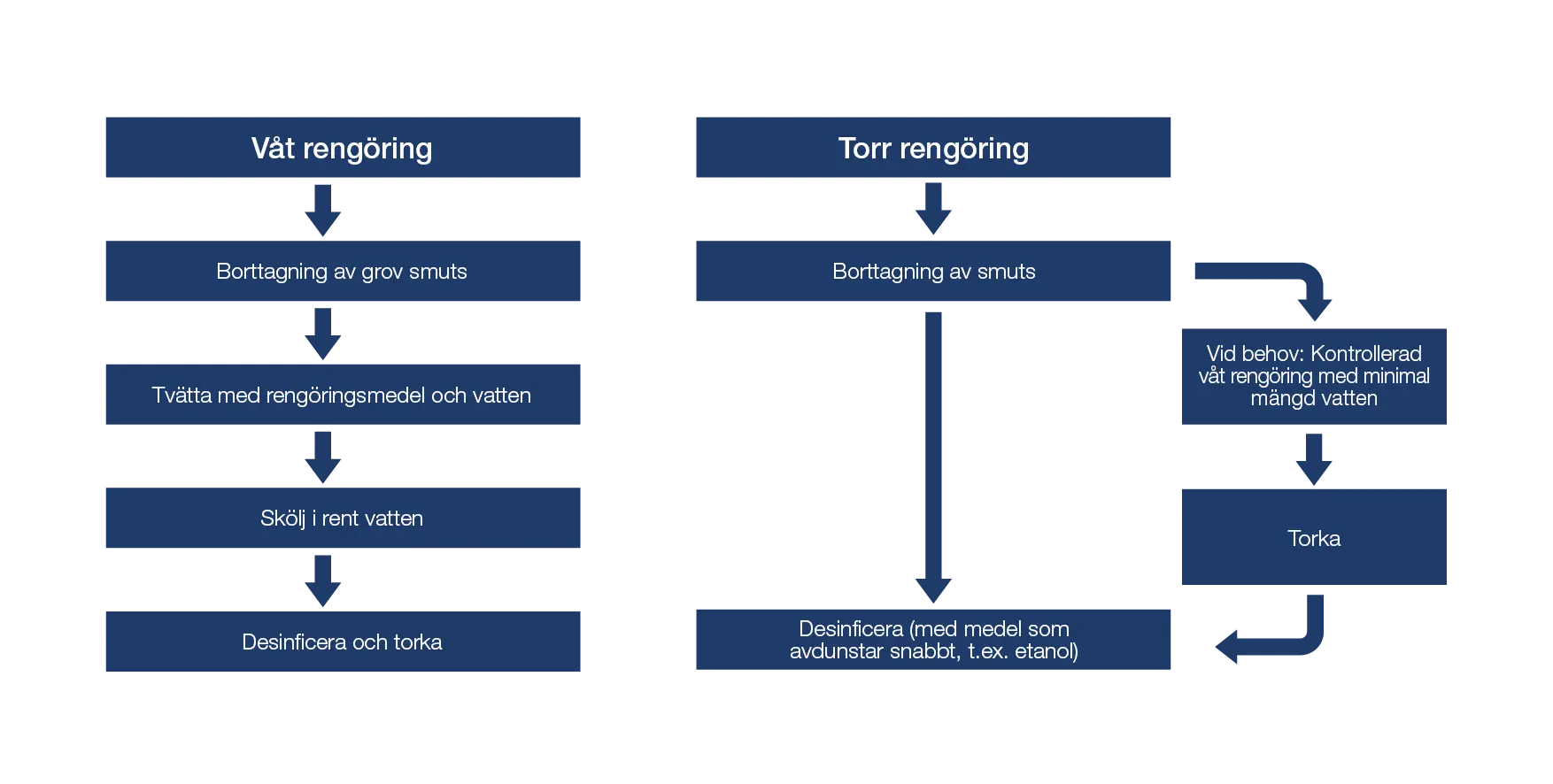 Vid torr rengöring ska du undvika att använda vatten, och desinfektionsmedlet måste vara av en typ som avdunstar snabbt. Vid behov kan en kontrollerad våt rengöring med minimal mängd vatten utföras. Var noga med att låta utrustningen torka efter kontrollerad våt rengöring, eftersom eventuell kvarvarande fukt kan öka risken för mikrobiell tillväxt och korskontaminering.